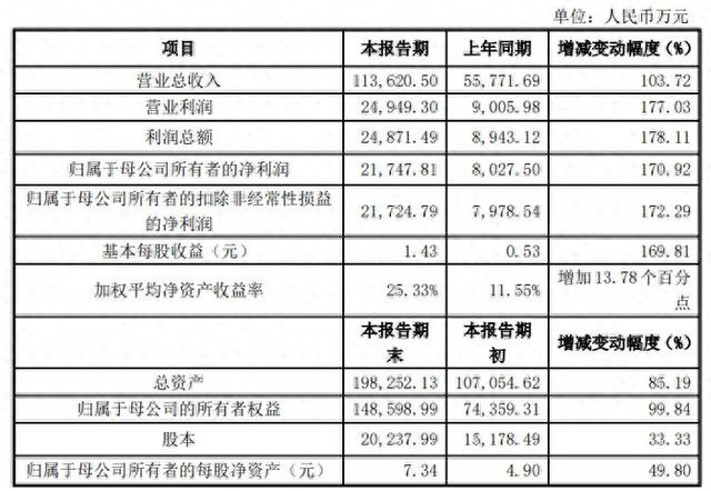 报告期末,先锋精密总资产 198,252.13 万元,较期初增长 85.19%;归属于母公司的所有者权益 148,598.99 万元,较期初增长 99.84%。